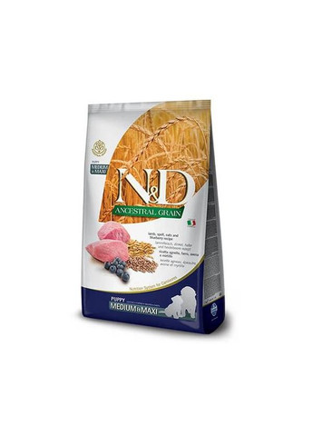N&D LOW GRAIN DOG LAMB&BLUEBERRY PUPPY MEDIUM&MAXI повнораціонний корм із низьким вмістом зерна для цуценят середніх та великих порід, вагітних і собак (ягня, чорниця), який містить обмежену кількість спадкових злаків (спельта й овес). 60% високоякісних інгредієнтів тваринного походження, 10% органічного вівса та 10% спельти, овочів, фруктів, вітамінів і мінералів. Немає традиційних зернових, як-от рис і кукурудза. Як інгредієнти тваринного походження корм містить свіже м'ясо ягняти та жири тільки тваринного походження. Білки та жири тваринного походження набагато краще засвоюються в кішок, ніж їхні рослинні аналоги. Завдяки використанню спельти та вівса ми отримуємо поступову та помірну глікемічну відповідь після приймання їжі. І на відміну від традиційно використовуваних круп, спельта й овес містять більшу кількість клітковини, яка покращує травлення і сприяє виведенню токсинів і шлаків з організму N&D Ancestral Grain багата на високоякісні вітаміни. Завдяки технології тривалого збереження вітамінів (Long Life Vitamins) всі вітаміни вносяться наприкінці виробничого процесу, після екструзії та сушіння. Це дає змогу захистити їх від впливу механічних і термічних чинників під час виробництва та гарантує збереження вітамінів упродовж усього терміну придатності. Джерелом вітамінів і мінеральних компонентів слугують фрукти й овочі, як-от гранат, яблуко, апельсин, чорна смородина, чорниця, шпинат і морква. Яблуко та гранат — природні джерела харчових волокон, які допомагають перистальтиці. Вони багаті на фітонциди та натуральні антиоксиданти, які захищають організм від вільних радикалів. Смородина та чорниця містять вітаміни та натуральні антиоксиданти, що борються зі старінням і серцевою недостатністю. Шпинат, крім великого набору вітамінів, містить залізо та інші мінерали, що сприяють очищенню організму та перешкоджають анемії. Апельсин — джерело вітаміну С і мінеральних солей, що запобігають діурез і мають очисні властивості. Морква багата на вітамін А й антиоксиданти. Natural&Delicious багаті люцерною, подорожником, розмарином, куркумою, алое вера та зеленим чаєм, які тонізують і зміцнюють органи та тканини, стимулюють ліквідацію токсинів. Ця дієта запобігає ожирінню і діабету через низький глікемічний індекс і містить тільки природні антиоксиданти, багата на екстрактом токоферолів, які сприяють природному збереженню продукту. Склад: свіже м'ясо ягняти без кісток (20%), дегідратоване м'ясо ягняти (20%), спельта (10%), овес (10%), курячий жир, свіжа оселедець, дегідратована оселедець, дегідратовані цільні яйця, пульпа цукрових буряків, риб'ячий жир (селди), волокна гороху, сушена морква, сушена люцерна, інулін, фруктоолігосахариди, маннаноолігосахариди, сушена чорниця (0,5%), сушений шпинат, подорожник (0,3%), сушені яблука, сушена смородина, дегідратований солодкий апельсин, сушений гранат, хлорид натрію, сухі пивні дріжджі, корінь куркуми (0,2%), глюкозамін, хондроїтин сульфат, екстракт календули (джерело лютеїну). Харчові добавки на кг. : Вітамін A — 16000 МО; Вітамін D3 — 1600 МО; Вітамін Е — 600 мг; Вітамін С — 160 мг; Ніацин — 40 мг; Пантотенова кислота — 16 мг; Вітамін В2 — 8 мг; Вітамін B6 — 6,4 мг; Вітамін В1 — 4,8 мг; Вітамін H — 0,40 мг; Фолієва кислота — 0,48 мг; Вітамін В12 — 0,1 мг; Холіну хлорид — 2800 мг; Бета-каротин — 1,5 мг; Хелат цинку аналогічний метіонін гідроксилазі — 910 мг; Хелат марганцю аналогіч
