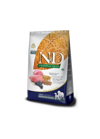 N&D LOW GRAIN DOG LAMB&BLUEBERRY ADULT MEDIUM&MAXI повнораціонний корм із низьким вмістом зерна ддля дорослих собак середніх ікрупних порід із нормальним рівнем фізичної активності (ягня, чорниця), який містить обмежену кількість спадкових злаків (спельта й овес). 60% високоякісних інгредієнтів тваринного походження, 10% органічного вівса та 10% спельти, овочів, фруктів, вітамінів і мінералів. Немає традиційних зернових, як-от рис і кукурудза. Як інгредієнти тваринного походження корм містить свіже м'ясо ягняти та жири тільки тваринного походження. Білки та жири тваринного походження набагато краще засвоюються в кішок, ніж їхні рослинні аналоги. Завдяки використанню спельти та вівса ми отримуємо поступову та помірну глікемічну відповідь після приймання їжі. І на відміну від традиційно використовуваних круп, спельта й овес містять більшу кількість клітковини, яка покращує травлення і сприяє виведенню токсинів і шлаків з організму N&D Ancestral Grain багата на високоякісні вітаміни. Завдяки технології тривалого збереження вітамінів (Long Life Vitamins) всі вітаміни вносяться наприкінці виробничого процесу, після екструзії та сушіння. Це дає змогу захистити їх від впливу механічних і термічних чинників під час виробництва та гарантує збереження вітамінів упродовж усього терміну придатності. Джерелом вітамінів і мінеральних компонентів слугують фрукти й овочі, як-от гранат, яблуко, апельсин, чорна смородина, чорниця, шпинат і морква. Яблуко та гранат — природні джерела харчових волокон, які допомагають перистальтиці. Вони багаті на фітонциди та натуральні антиоксиданти, які захищають організм від вільних радикалів. Смородина та чорниця містять вітаміни та натуральні антиоксиданти, що борються зі старінням і серцевою недостатністю. Шпинат, крім великого набору вітамінів, містить залізо та інші мінерали, що сприяють очищенню організму та перешкоджають анемії. Апельсин — джерело вітаміну С і мінеральних солей, що запобігають діурез і мають очисні властивості. Морква багата на вітамін А й антиоксиданти. Natural&Delicious багаті люцерною, подорожником, розмарином, куркумою, алое вера та зеленим чаєм, які тонізують і зміцнюють органи та тканини, стимулюють ліквідацію токсинів. Ця дієта запобігає ожирінню і діабету через низький глікемічний індекс і містить тільки природні антиоксиданти, багата на екстрактом токоферолів, які сприяють природному збереженню продукту. Склад: Свіже м'ясо ягняти без кісток (20%), дегідратоване м'ясо ягняти (18%), спельта (10%), овес (10%), дегідратовані цільні яйця, свіжа оселедець, дегідратована оселедець, тваринний жир, риб'ячий жир, пульпа цукрових буряків, волокна гороху, сушена морква, борошно люцерни, інулін, фруктоолігосахариди, маннанолігосахариди, порошок чорниці (0,5%), сухі яблука, порошок граната, дегідратований солодкий апельсин, порошок шпинату, подорожник (0,3%), порошок чорної смородини, хлорид натрію, пивні дріжджі, корінь куркуми (0,2%), глюкозамін, хондроїтин сульфат, екстракт календули (джерело лютеїну). Харчові добавки на кг. : Витамин А – 15000ME; Витамин D3 – 1500 ME; Вітамін Е — 600 мг; Вітамін С — 150 мг; Ніацин — 37,5 мг; Пантотенова кислота — 15 мг; Вітамін B2 — 7,5 мг; Вітамін В6 — 6 мг; Вітамін В1 — 4,5 мг; Вітамін H — 0,38 мг; Фолієва кислота — 0,45 мг; Вітамін B12 — 0,1 мг; Холіну хлорид — 2500 мг; Бета-каротин — 1,5 мг; Хелат цинку аналогічний метіонін гідроксилазі — 9