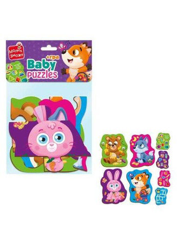 Захоплююча, настільна гра "Бебі пазли" VT1106 - 85 відрізняється зображенням улюблених анімаційних героїв з мультфільмів. Пазли- універсальна розвага, яку люблять і діточки, і дорослі. Головна перевага цього ігрового набору полягає у барвистій картинці, представленій в приємній кольоровій гамі, яка не дратує дитячі очки. Для створення набору використаний безпечний картон, а також екологічно чистий і нешкідливий піноматеріал, приємний для тактильних відчуттів. Захоплююча дитяча гра, спрямована на тренування дрібної моторики, логічного мислення, пам'яті і просторового сприйняття, на довгий час захопить малюка в цікавий світ кольорових картинок. "Бебі пазли" сподобаються і хлопчикам, і дівчаткам, тому такий подарунок стане універсальним для будь-якого свята. Цікава гра прекрасно впливає на психоемоційний стан крихітки, сприяє формуванню посидючості і самостійності.