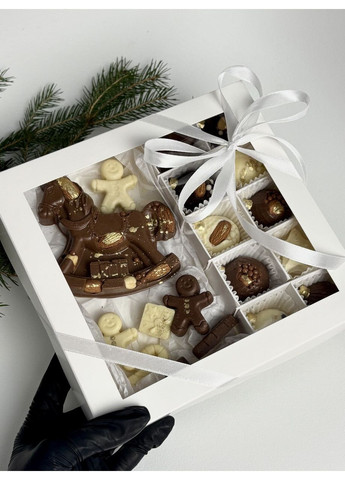 Подарунковий набір в виконанні Berry_Bar смачніх новорічні шоколадні цукерок у подарунковій упаковці - смакує по-особливому! Цукерки – ручної роботи, виготовлена з якісного бельгійського білого шоколаду (молочного, чорного та білого) і горіхів. Це чудовий та завершений подарунок для новорічних свят, в білій коробці і з білим подарунковим паперовим пакетиком в комплекті. Крафтові шоколадні цукерки вага: 245 грам. Розмір коробки: 20 на 19 см та висотою 3 см. Харчова цінність на 100г : білки -7.5г, Жири - 36.8г, Вуглеводи - 50г Енергетична цінність на 100г: 550 кКал Склад: шоколад молочний (цукор, какао-масло 34%, сухе молоко, какао-маса, емульгатор – лецитин, натуральний ароматизатор – ванілін), шоколад білий (цукор, какао-масло 31%, сухе молоко, емульгатор – лецитин, натуральний ароматизатор – ванілін), шоколад чорний (цукор, какао-масло 55%, емульгатор, какао-маса) горіхи (фундук, мигдаль,, арахіс), цукрові кульки (цукор, крохмаль, глазур), повітряні рисові кульки (рис, цукор), сіль харчова. Може містити сліди глютену, лісових горіхів (фундука, кеш'ю, мигдалю, фісташок), сої та насіння кунжуту, люпину. Умови зберігання: зберігати у сухих, чистих добре вентильованих приміщеннях, які не мають стороннього запаху, не заражені шкідниками хлібних запасів, за температури (18+\-3)°С і відносної вологості повітря не вище ніж 75%. Термін придатності : 4 місяці від дати виробництва