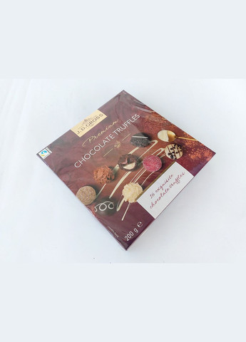 Бельгійський трюфельний шоколад класу преміум J.D Gross Premium Chocolate Truffles. До шоколадного набору входить 16 ексклюзивних вишуканих цукерок із різними начинками: ванільний крем і еспресо, фундук апельсин, ваніль із Мадагаскару, шоколадна піна, вершки та сир маскарпоне, чорна смородина та вершки, пломбір. Енергетична цінність в 100 г продукту – 487 ккал / 2033 кДж Жири 27,8 г (з них насичені жирні кислоти 16,7 г) Вуглеводи 55,6 г Білки 4,2 г Сіль 0,13 г.