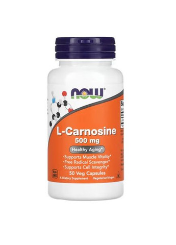 Опис Здорове старіння Підтримує активність м’язів Нейтралізує вільні радикали Забезпечує цілісність клітин Без ГМО Дієтична добавка Вегетаріанський і веганський продукт Кошерний продукт Амінокислоти Сімейне підприємство, засноване в 1968 році Виготовлено на підприємстві, що має реєстрацію GMP L-карнозин (бета-аланіл-L-гістидин) — це дипептид, що складається з аланіну та гістидину. У природі він міститься у високій концентрації в м’язах та нервових тканинах, і, як відомо, його рівень знижується з віком. L-карнозин захищає клітинні та тканинні структури під час старіння організму завдяки своїй здатності нейтралізувати вільні радикали та стабіліувати мембрани. Рекомендації із застосування Приймати по одній (1) капсулі 1–3 рази на день, бажано під час їжі. Інші інгредієнти Гіпромелоза (целюлозна капсула), стеаринова кислота (рослинного походження) і стеарат магнію (рослинного походження).