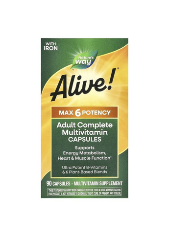 Alive! Adult Complete Multivitamin від Nature's Way – це мультивітамінний комплекс, створений для дорослих, без додавання заліза Розмір порції: 6 капсул Кількість порцій: 15 Кількість на порцію % від добової потреби † Калорії 5 Всього вуглеводів 1 г <1%† Вітамін А (77% [3000 мкг] бета-каротину, 23% [891 мкг] ретинілацетату) 3891 мкг 432% Вітамін С (аскорбінова кислота) 1000 мг 1111% Вітамін D (ергокальциферол) 25 мкг 125% Вітамін Е (d-альфа-токоферилсукцинат) 134 мг 893% Вітамін К (фітонадіон) 120 мкг 100% Тіамін (мононітрат тіаміну) 25 мг 2083% Рибофлавін 25 мг 1923% Ніацин (ніацинамід) 125 мг 781% Вітамін B6 (піридоксин гідрохлориду, піридоксаль-5-фосфат) 50 мг 2941% Фолат 400 мкг DFE ( 418 мкг Quatrefolic® (6S)-5'-метилтетрагідрофолат глюкозамінової солі) 100% Вітамін B12 (метилкобаламін) 80 мкг 3333% Біотин 33 мкг 110% Пантотенова кислота (пантотенат D-кальцію) 125 мг 2500% Холін (бітартрат холіну) 30 мг 5% Кальцій (цитрат кальцію, карбонат, пантотенат D-кальцію) 262 мг 20% Йод (йодид калію та з водоростей) 150 мкг 100% Магній (цитрат та оксид магнію) 125 мг 30% Цинк (глюконат цинку) 15 мг 136% Селен (L-селенометіонін) 158 мкг 287% Мідь (хелат бісгліцинату міді) 0,9 мг 100% Марганець (хелат бісгліцинату марганцю) 5,8 мг 252% Молібден (молібдат натрію) 45 мкг 100% Калій (цитрат калію) 50 мг 1% Натрій 10 мг < 1% Калій (цитрат калію) 50 мг 1% Суміш Daily Greens™, що містить амінокислоти: 400 мг ** спіруліна, водорості, люцерну (лист, стебло, квітка), ячмінь (трава), будяк (стебло, лист, квітка), синьо-зелені водорості (Aphanizomenon flos-aquae), хлорелла (мікро-водорості), кінза (листя), кульбаба (надземні частини), меліса лимонна (листя), лимонна трава (Cymbopogon citratus), кропива (Urtica spp.) (листя), подорожник (листя), пшениця (трава) Порошкова суміш фруктів та садових овочів: 200 мг ** чорниця, апельсин, морква, гранат, слива, полуниця, яблуко, буряк, вишня, груша, помідор, цвітна капуста, малина, асаї, спаржа, банан, броколі, брюссельська капуста, капуста, журавлина, огірок, виноград, горох, ананас гарбуз, шпинат Кардіо-суміш: 100 мг ** глід (ягода), екстракт горця японського (корінь), стандартизований до 50% ресвератролу (5 мг), коензим Q10 (убіхінон 10) Суміш травних ферментів: 100 мг ** концентрована формула ферментів (протеаза I, протеаза II, амілаза, лактаза, пептидаза, целюлаза, інвертаза, альфа-галактозидаза, ліпаза), бетаїн гідрохлорид, бромелаїн, папаїн Захисна суміш грибної міцелії та біомаси примордії 100 мг ** органічний рейші (Ganoderma lucidum), органічний шиїтаке (Lentinula edodes), органічна глива (Pleurotus ostreatus), органічний енокітаке (Flammulina velutipes), органічний майтаке (Grifola Frondosa), органічний ожина гребінчаста органічний чай (Inonotus obliquus), органічний агарик бразильський (Agaricus brasiliensis/blazei), органічний траметес різнокольоровий (Trametes versicolor), органічний мешим (Phellinus linteus), органічний зонтовий трутовик (Grifola umbellata) Омега 3/6/9 Суміш насіння жирних кислот 100 мг ** Порошок насіння льону, порошок насіння соняшнику Комплекс цитрусових біофлавоноїдів (з апельсина, грейпфрута, лимона, лайма, мандарину), що містить: 60 мг ** гесперидин, нарингін, нарірутин, ериоцитрин, флавоноли та флавони. Елеутерокок (корінь) 50 мг ** Інозитол 50 мг ** Екстракт рутину (софора японська) (квіткові бруньки) 25 мг ** Лютеїн (екстракт календули ацтеків) (квітка) 500 мкг ** † Відсоток від добової потреби заснований на дієті в 2000 калорій. ** Добову потребу не визначено.