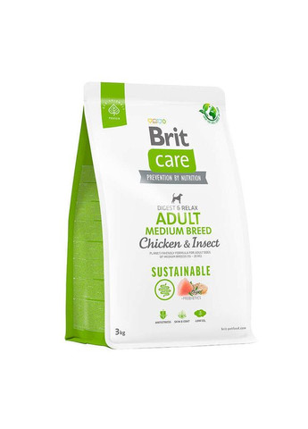 Екологічний корм суперпреміуму класу Dog Sustainable Adult Medium Breed з куркою та комахами для собак середніх порід (від 10 до 25 кг). Рецептура з низьким СO2 менший вплив на навколишнє середовище (на 35% менше в порівнянні з іншими кормами). Корм виготовлений тільки із екологічно чистих інгредієнтів. Особливостями раціону є включення до складу: жирних омега-3 кислот, що покращують стан шкіряного та вовняного покриву собаки; L-триптофану, який забезпечить підтримку нервової системи у стресових ситуаціях; собачої кропиви: знімає тривогу, надає антистресову дію. Живлення кормом Brit Care зміцнює імунну систему вашого улюбленця, покращує фізичну форму та налагоджує роботу органів травлення. Поживні, легкозасвоювані білки з повним амінокислотним складом містять у тонусі м'язи та тканини. Безглютеновий корм підходить домашнім вихованцям, схильним до набору зайвої ваги. Склад: курка (36%) (дегідрована курка, гідролізована курка), овес (30%), дегідровані комахи (14%), курячий жир, сушена м'якоть яблука, натуральний ароматизатор, пивні дріжджі, лососева олія (2%), горохова/2 фруктоолігосахариди (200 мг/кг), хондроїтину сульфат (200 мг/кг), мананолігосахариди (150 мг/кг), юкка Мохаве (150 мг/кг), насіння /кг), β-глюкани (50 мг/кг), порожній сушена (50 мг/кг), пробіотик Lactobacillus helveticus HA – 122 інактивовані (15х109 клітин/кг). Аналітичні компоненти: сирий білок 26,0%, сирий жир 16,0%, вологість 10,0%, сира зола 6,0%, сира клітковина 2,8%, кальцій 1,3%, фосфор 1,0%, натрій 0,2%, омега-3 жирні кислоти 2,0%, ЕПК (20:5 п-3) 0,05%, ДГК (22:6 п-3) 0,1%. Харчові добавки на 1 кг: вітамін А (3a672a) 20000 МО, вітамін D3 (3a671) 1500 МО, вітамін Е (3a700) 500 мг, вітамін С (3a312) 300 мг, таурин (3a370) 1500 (3a910) 250 мг, вітамін B1 (3a821) 2,5 мг, вітамін B2 (3a825i) 9,6 мг, біотин (3a880) 3,5 мг, фолієва кислота (3a316) 1,2 мг, вітамін B6 (3a831)4 25 мг, ніацинамід (3a315) 32,5 мг, вітамін B12 0,1 мг, йод (3b201) 0,8 мг, органічний цинк (3b606) 85 мг, органічний марганець (3b504) 40 мг, органічна мідь (3b407) 1 органічний селен (3b810) 0,16 мг, L-триптофан (3c440). Містить схвалені ЄС антиоксиданти: екстракти токоферолу з олії (1b306(i)), аскорбілпальмітат (1b304) та екстракт розмарину. Енергетична цінність : 3930 ккал/кг Рекомендовані норми годівлі : Вага собаки, кг <10 10 15 20 25 25 < Денна норма, г/день Доросла мала порода 130 180 220 250 Доросла велика порода *Інформація про інгредієнти та нутрієнтний склад корму, норми годівлі на сайті є довідковою. Вся інформація про продукт представлена безпосередньо на пакованні. Щоб уникнути перегодівлі та можливого ожиріння, орієнтуйтеся на вказане виробником дозування у таблиці годівлі. Іноді норма може відрізнятись. Це може бути викликано умовами довкілля, способом життя та індивідуальними особливостями організму Вашого вихованця. Якщо Ви переводите Вашого чотирилапого друга на корм цієї марки з іншого, то рекомендується зміна живлення зробити плавним. Протягом семи днів поступово скорочуйте кількість старого корму та збільшуйте дозу нового. Зверніть увагу, що тварині потрібна свіжа вода. Фасування: 1 кг, 3 кг, 12 кг