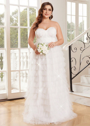Ця елегантна весільна сукня має чисто білий дизайн із хитромудрими 3D-квітковими та мереживними прикрасами. Сукня включає багатошаровий дизайн тюлю і класичний виріз без бретельок. Вона включає застібку-блискавку і контрастне сітчасте оздоблення. Тканина не тягнеться та забезпечує стандартну посадку.