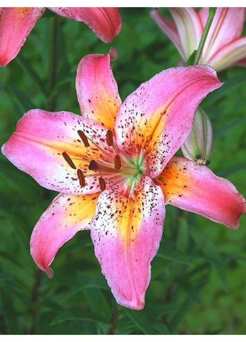 Лілія Fancy Dance - елегантна та ніжна лілія, що виглядає напрочуд декоративно. Природа справді постаралася та добряче попрацювала над створенням такої краси. Пелюстки насиченого рожевого кольору з чіткою білою облямівкою створюють враження, ніби квітка одягнена в пишну сукню для балу. В центрі — дрібні темні цяточки, які надають ще більше текстури та глибини. Аромат в неї легкий та ледь відчутний, тому навіть для алергіків це ідеальна рослина. Виростає до 80–100 см, формує великі квіти (до 15 см у діаметрі), розташовані на міцних прямостоячих стеблах. Цвіте в середині літа, зберігаючи декоративність понад два тижні. Добре підходить як для міксбордерів, так і для зрізу: у вазі виглядає не менш ефектно, ніж у саду. Це азіатський гібрид - отже, він дуже витривалий, стійкий до хвороб і дуже простий у догляді. Найкраще росте на сонячному місці з легким ґрунтом. Не потребує викопування на зиму й не вибагливий до поливу - головне, не садіть у важку, заболочену землю. Тому сміливо висаджуйте одразу декілька цибулин, бо групова посадка такої краси викликає просто шквал емоцій та вражень! Ідеальні умови для вирощування: щоб лілії щороку тішили вас рясним цвітінням, варто подбати про правильні умови вирощування. І перше, що варто пам’ятати, ці квіти найкраще почуваються на сонячній ділянці, де світло потрапляє щонайменше пів дня. При цьому місце повинне бути захищене від сильного вітру, але добре провітрюватись, адже застій повітря може провокувати грибкові захворювання. Ґрунт для лілій повинен бути легким, пухким і добре дренованим. Категорично не підходять заболочені чи важкі глинисті ґрунти — у таких умовах цибулини часто загнивають. Ідеальним буде слабокислий або нейтральний pH (близько 6–6,5). Перед посадкою у ґрунт бажано внести компост, перегній або золу — особливо якщо вирощуєте азіатські гібриди. Важливо обирати місце, де раніше не росли інші цибулинні культури, щоб уникнути ризику зараження ґрунту збудниками хвороб. Посадку найкраще проводити у вересні, хоча для деяких сортів допускається й весняна висадка. Глибина посадки залежить від типу ґрунту: на легких садять глибше (до 15–20 см), на важких — мілкіше (10–12 см). Відстань між цибулинами — приблизно 20–30 см залежно від сорту. Поливати лілії слід регулярно, але без перезволоження. Найкраще поливати рідко, але рясно, особливо в період формування бутонів. Обов’язковим є розпушування ґрунту й мульчування — це допомагає зберегти вологу та зменшує коливання температур у прикореневій зоні. Після завершення цвітіння варто обрізати лише відцвілі бутони, залишаючи зелене листя, щоб цибулина могла набратися сил. На зиму більшість лілій можна залишати в ґрунті, особливо якщо ваш регіон має м’який або помірний клімат. У більш холодних умовах варто прикрити посадки шаром мульчі, соломи або лапника.