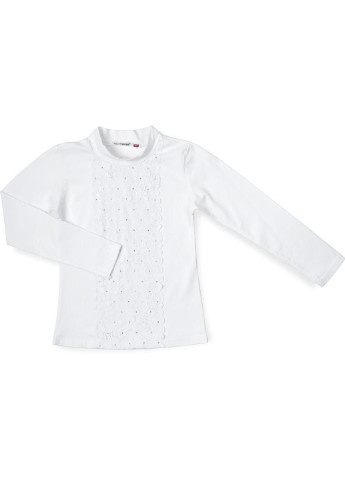 Чудова модна модель напівприлеглого силуету з довгим рукавом і коміром-стійкою, з м'якого, якісного турецького бавовняного трикотажу, з додаванням невеликого % еластану для підтримки форми. Нижня частина переда прикрашена широкою смугою ніжного, сніжно-білого еластичного мережива, а вгорі атласним бантом із квадратним пришивним кристалом. Горловина добре тягнеться і не завдасть незручностей при одяганні. Трикотаж тонкий, дуже м'який і приємний на дотик.