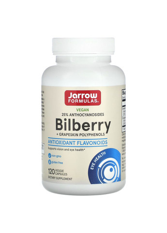 Чорниця - чорні з сизим нальотом ягоди, містить вітаміни групи В, pp, С, пектинові і дубильні речовини, каротин, органічні кислоти, антоціани, мікроелементи, ефірні масла, містить велику кількість марганцю Розмір порції: 1 капсула Кількість порцій: 120 Кількість на порцію % від добової потреби Екстракт шведської чорниці (Vaccinium myrtillus) (плоди) (25% [20 мг] антоціанозидів) 80 мг * Екстракт виноградної шкірки (Vitis vinifera L.) (макуха) (30% [60 мг] поліфенолів) 200 мг * *Добова потреба не визначена.