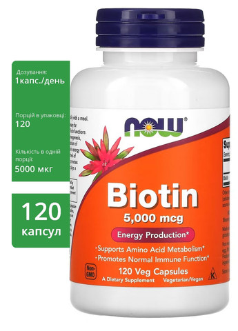 Біотин — це водорозчинний вітамін, необхідний для нормального росту та функціонування організму. Біотин функціонує як ключовий регуляторний елемент у глюконеогенезі, синтезі жирних кислот і метаболізмі деяких амінокислот. Крім вироблення енергії, біотин покращує синтез певних білків. Крім того, біотин сприяє нормальній роботі імунної системи й відіграє важливу роль у підтримці здоров’я шкіри. Рекомендації із застосування Приймати по 1 капсулі на день під час їди. Попередження Тільки для дорослих. Перед початком застосування під час вагітності, грудного вигодовування, за наявності захворювань або в разі приймання медичних препаратів слід проконсультуватися з лікарем. Зберігати в недоступному для дітей місці. Цей продукт містить біотин, який може впливати на результати деяких аналізів крові. Колір продукту може змінюватися природним чином. Після відкриття упаковки зберігати в сухому прохолодному місці.