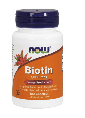 Biotin 1000 mcg – унікальний продукт від компанії NOW , який містить Біотин (також відомий як коензим R, вітамін H або B7), що відіграє важливу роль у процесі нормального зріст та функціонування організму. Біотин, як прийнято вважати, є не лише важливим компонентом для росту волосся, але й необхідний для здорового стану шкіри, нігтів, внутрішніх органів, нормального перебігу фізіологічних процесів, таких як ріст та метаболізм клітин. Біотин відіграє у вуглеводному обміні, взаємодіючи з гормоном підшлункової залози інсуліном. Крім того, біотин бере участь у виробництві так званої глюкокінази – речовини, яка запускає обмін глюкози. Неабияку роль відіграє біотин і в синтезі глікогенів – вуглеводів, що накопичуються в печінці та м'язах, а також у засвоєнні цих запасів, що позитивно впливає на підтримку стабільного рівня цукру в крові. Крім цього, він допомагає також засвоювати білок і допомагає в обміні речовин, бере участь у розкладанні жирних кислот та спалюванні жиру. Біотин контролює обмін жирів і переважно знаходиться у клітинах шкіри та волосся, він, природно, впливає на вміст жиру у шкірі. Поживна цінність в одній порції (1 капсула): Вітамін С – 4 мг Біотин – 1 мг (1000 мкг) Інші інгредієнти: Рисове борошно, желатин (капсула), аскорбіл пальмітат та кремній. Рекомендації щодо застосування: Приймати по 1 капсулі щодня під час їжі.