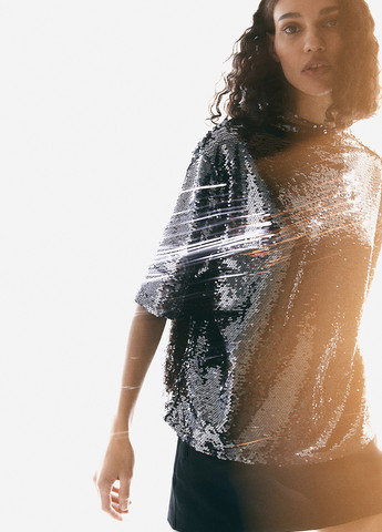 Коротка блуза з сітки з блискітками. Вільний крій з невеликим коміром-стійкою та шлицею на ґудзиках. Злегка спущені плечі та короткі рукави. Підкладка з джерсі.
