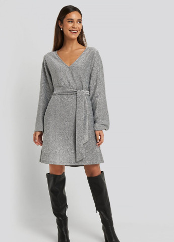 Це блискуча сукня з V-подібним вирізом, об'ємним рукавом, краєм, що розкльошує, і високою талією. Модель має стандартний крій, довгі рукави та нееластичну тканину. Сукня доповнена поясом та контрастними деталями з паєток, які надають образу святкового стилю.