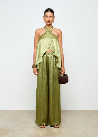 Комплект з атласу AiiRZ Cross Halter Neck включає блузу з халтер-воротом і штани вільного крою. Блузка без рукавів та без підкладки. Штани видовжені та широкі. Підходить для весіль та інших урочистостей. Інструкції з догляду: прання, не піддавати хімчистці.