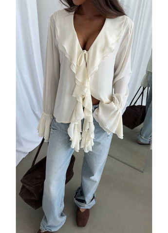Романтична шифонова блузка з воланами -справжній must-have для гардероба. Модель вирізняється мʼяким вирізом із завʼязкою, оздобленим широким воланом, що плавно переходить на передню частину. Рукави закінчуються пишними манжетами з фігурними рюшами, додаючи легкості та жіночності.