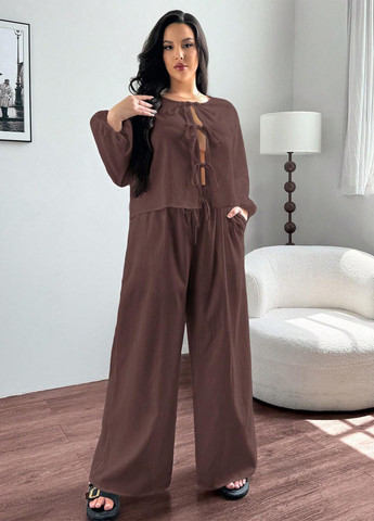 Костюм SHEIN Essnce Plus Size Lion Mountain. Цей комплект із двох частин складається з блузки з круглим вирізом та штанів широкого крою. Костюм не тягнеться та розрахований на вільну посадку. Включає кишені та рукави-бішоп.