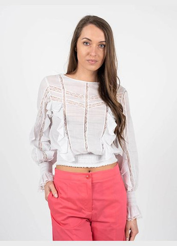 PATRIZIA PEPE (001448) Блуза біла із довгим рукавом із мереживними вставками та рюшами від італійського бренда PATRIZIA PEPE. Блузка виготовлена із рамі та бавовни. Тканина рамі - це продукт, який виготовляється з волокон особливого різновиду китайської кропиви. Блуза прямого крою, низ на широкій резинці, рукав довгий на резинці із рюшем. Матеріал рамі та бавовна. Склад 55% рамі 45% бавовна. Країна бренда - Італія, країна виробництва - Китай.