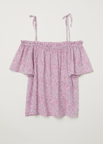 Блузка з відкритими плечима з тканини. Верх зібраний на гумку з невеликою оборкою, вузькі бретелі, що зав'язуються зверху, і короткі, широкі рукави. Можливе пошкодження бірки. У виробі можливе пошкодження бірки.