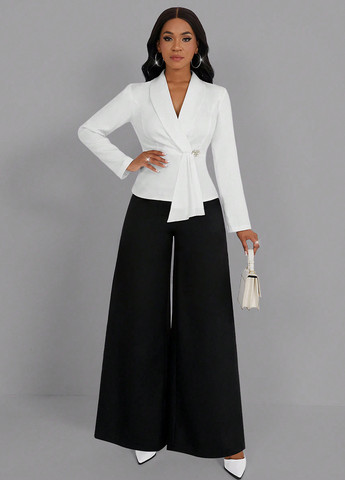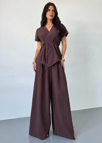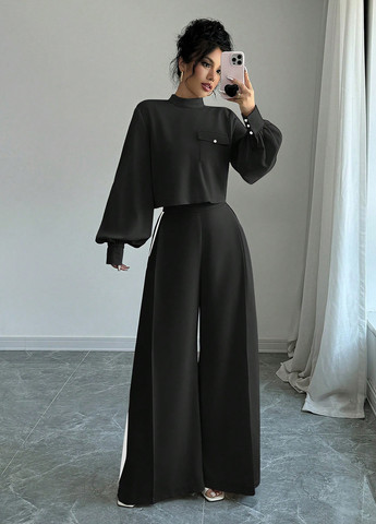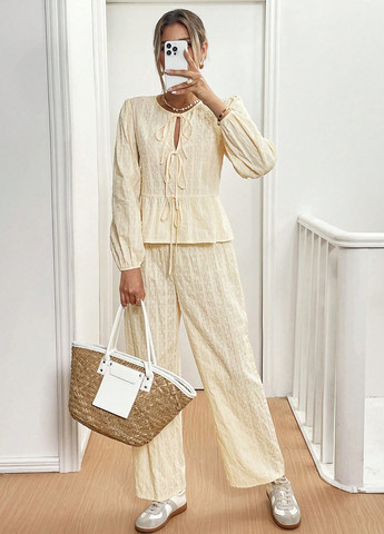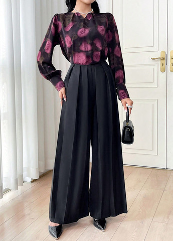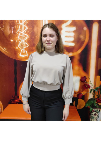 Блуза прямого силуету з м’якої тканини з матовим фінішем. Особливий акцент — подовжена драпірована деталь на шиї, яку можна зав’язати, обгорнути або залишити спадати вільно. Довгі рукави мають легке розширення донизу, створюючи елегантний силует у русі. Завдяки простому крою блуза поєднується як із класичними, так і з більш розслабленими речами, зокрема широкими штанами, денімом чи спідницями.