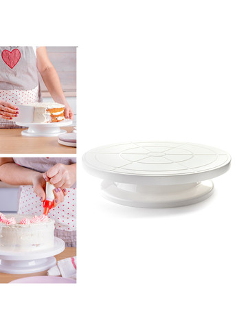 Поворотний стіл для торта або пряника — зручний та недорогий кондитерський інвентар. Даний товар для випічки вирішує ряд завдань для майстра-пекаря або господині, яка хоче порадувати близьких домашньою випічкою. Вам не потрібно бігати навколо торта або постійно крутити його на блюді, щоб розподілити крем або мастику, нанести декор або приклеїти їстівну картинку. Просто легким рухом руки переверніть підставку та, зручно стоячи на одному місці, робіть вашу випічку красивою та неповторною. При цьому користуйтеся якісним кондитерським інструментом: прасками, шкребками та стеками для мастики. Переваги Можливість наносити візерунок або декор на випічку під потрібним кутом. Підставка для торта обертова обладнана роликами (гумками, треками) на ніжці. Це дозволяє повернути випічку під зручним кутом; Чудова стійкість. Стіл для прикрашання тортів не ковзає, випічка добре тримається на ньому. До того ж ви можете скористатися зручними підкладками для торта. Щоб викласти гарно випічку для гостей та клієнтів, використовуйте підставки під торт та багатоярусні тістечка. Характеристики Матеріал: пластик Діаметр підставки: 28 см Висота підставки: 7 см Розмір в упаковці: 28 х 28 х 7 см Вага: 440 г Країна-виробник товару: Китай
