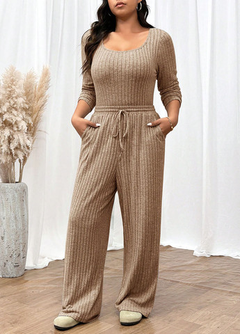 Цей комплект складається з двох предметів, боді в рубчик та штанів. Зручний домашній одяг. Ідеально підходить для тренувань або повсякденного носіння. У комплект входять боді з довгими рукавами та широкі штани. Модель має стандартний крій, трикотаж у рубчик та квадратний виріз горловини. Штани мають кишені.
