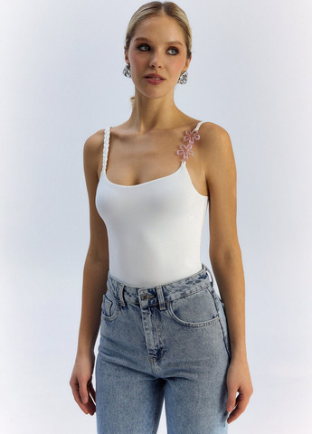 Трикотажний боді на тонких бретелях - одна плетена, інша із акцентною квітковою вставкою. Застібається на кнопки.