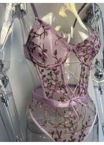 Еротичний "Боді - Монокіні" (теді, ігровий костюм, костюм для рольових ігор) через шию з прозорого квіткового мережива з трикутними чашечками та двома мереживними смужками переходять у труси, по центру чашечок і в паху розрізи, зав'язується ззаду, прикрашений маленькими бантиками, ззаду труси Т-стрінгами.