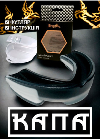 Екологічний термопластик: висока якість матеріалу виготовлення Без запаху: капа не має ніякого запаху та прикусу Футляр: міцний та зручний бокс для зберігання та транспортування Інструкція: докладний посібник з підготовки до застосування Фірмова упаковка: стильна та зручна упаковка ТМ GDragon Постійний контроль якості виробництва кожного екземпляра!