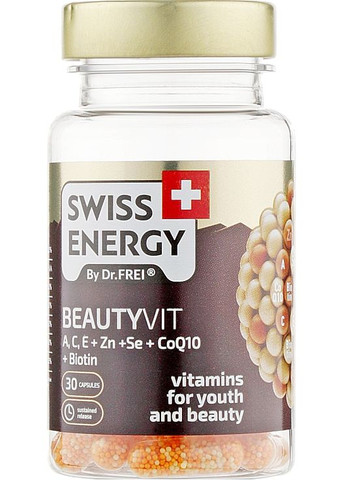 Захистить клітини від окислювального стресу, покращить стан шкіри, волосся і нігтів, а також загальне самопочуття! Усе, що для цього потрібно — додати до раціону вітаміни в капсулах «Краса і молодість» бренда Swiss Energy. Препарат на основі комплексу вітамінів і мікроелементів покращує зовнішній вигляд і самопочуття. Особливості Swiss Energy BeautyVit: - вітамін Е має антиоксидантну дію, запобігаючи передчасному старінню організму та прояву небажаної пігментації, стимулює загоєння ран, рубців, зміцнює судини, поліпшує кровообіг, регулює рівень гормонів, виводить токсини, зміцнює імунну систему, захищаючи від вірусів і бактерій, підвищує працездатність;- аскорбінова кислота має відновлювальні й антиоксидантні властивості, стимулює синтез колагену та проколагену, регенерацію сполучної та кісткової тканини, абсорбцію заліза в кишечнику, бере участь у синтезі гемоглобіну, забезпечує антиоксидантний захист, запобігаючи руйнуванню клітин, стимулює фібропласти, покращує стан;- коензим Q10 сприяє перетворенню накопиченої енергії на молекули АТФ, бере участь у дихальному ланцюжку перенесення електронів, має антиоксидантні властивості;- цинк бере участь у виробництві білків, синтезі ДНК, контролює поділ клітин, підтримує імунну систему, сприяє загоєнню ран;- біотин бере участь у вуглеводному, білковому і жировому обміні, забезпечуючи організм потрібною енергією, нормалізує роботу шлунково-кишкового тракту, зміцнює імунітет і нервову систему, сприяє росту волосся, нігтів і хрящової тканини;- селен має антиоксидантні властивості, підвищує еластичність тканин, поліпшує надходження кисню в серцевий м'яз, омолоджує популяцію клітин, стимулює синтез родопсину в сітківці ока.