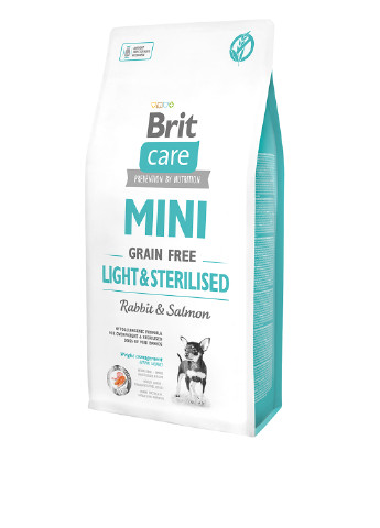 Brit Care Mini Light&Sterilised — це сухий беззерновий гіпоалергенний корм для собак мініатюрних порід із надмірною вагою або стерилізованих собак. Склад: Борошно з м'яса кролика (25%), білок зі свіжого лосося (15%), жовтий горох, нут, бамбукова лігноцелюлоза, сушене яблуко, гречаа, лляне насіння (4%), курячий жир (консервований токоферолами), риб'ячий жир із лосося (2%), лушпиння та насіння псиліуму (1%), пивні дріжджі, водорості (0,5%, Ascophyllum Todosum), хлорид натрію, гідролізовані панцири ракоподібних (джерело глюкозаміну, 260 мг/кг), лохина (230 мг/кг, джерело поліфенолів 70 мг/кг і флавоноїдів 30 мг/кг), хрящовий екстракт (джереловід хондроїтину, 160 мг/кг. мг/кг), маннан-олігосахариди (150 мг/кг), трави та фрукти (розмарин, цитрусові, куркума), 150 мг/кг), фруктоолігосахариди (100 мг/кг), юка (Yucca schidigera) (100 мг/кг), журавлина (100 мг/кг), іну (90 мг), молочний рисополох (75 мг/г), обліпаг. рушинна (75 мг/кг), ромашка (30 мг/кг), гвоздика (30 мг/кг), шавлія (25 мг/кг). Рекомендації щодо годівлі: Собаки мініатюрних порід вирізняються високим рівнем потреби в енергії та мають порівняно невеликий травний тракт і шлунок. Тому рекомендована щоденна кількість корму, вказана в таблиці, треба розділити на 2-3 рівні порції та давати впродовж дня. Корм потрібно давати сухим або злегка зволоженим водою кімнатної температури. Якщо Ви даєте корм Brit Care вперше, змішайте його зі звичним кормом і поступово збільшуйте кількість корму Brit Care протягом 7 днів. Щоденна кількість корму може відрізнятися залежно від умов довкілля, рівня активності та віку собаки. У собаки завжди має бути доступ до джерела свіжої питної води. Гарантований аналіз: Сирий білок 26%, сирий жир 12%, волога 10%, сира зола 5.5%, сира клітковина 8.5%, кальцій 1.1%, фосфор 0.9%, Омега-3 жирні кислоти 1.5%, Омега-6 жирні кислоти 1.3%. Поживні добавки на 1 кг: Вітамін А (3a672a) 20 000 ME; вітамін D3 (E671) 1 500 ME; вітамін E (α-токоферол) (3a700) 500 мг; вітамін C (3a312) 300 мг; холінхлорид (3a890) 700 мг; таурин (3a370) 200 мг; біотин (3a880) 3 мг; вітамін В1 (3a821) 1 мг; вітамін2 — 4 мг; ніацинамід; ні (3a315) 12 мг; кальцію D-пантотенат (3a841) 10 мг; вітамін В6 (3a831) 1 мг; фолієва кислота (3a316) 0.5 мг; вітамін В12 0.04 мг; L-карнітин (3a910) 200 мг; хелат цинку гідрату амінокислот 100 мг; моногідрат сульфату заліза 80 мг; оксид марганцю 40 мг; йодид калію 0.75 мг; хелат міді та амінокислот n-гідрат 15 мг; органічна форма селену, похідна від життєдіяльності дріжджів Saccharomyces Cerevisiae CNCM I-3060 0.2 мг. Енергетична цінність: 3800 ккал/кг Термін придатності вказаний на пакованні. Зберігати в сухому, прохолодному місці. Містить схвалені ЄС антиоксиданти.