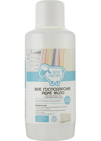 Господарське мило – найпотрібніша і затребувана в побуті річ, застосування якої не потребує додаткових коштів, зусиль і навичок! Універсальний продукт відомий багатьом як компактний брусок коричневого кольору, але технологи українського бренда «Біла овечка» вирішили позбутися від цього стандарту і подарували світові абсолютно нове творіння. 100 % Power має рідку консистенцію молочного відтінку, яка чудово справляється зі своїми основними обов'язками, визначається ергономічністю і не залишає після себе ніяких слідів, крім чистоти, свіжості і гігієнічності! Особливості 100 % Power бренда «Біла Овечка»: - виготовлений на основі з натурального калійного мила й ефірної олії ялиці; - підходить для миття посуду, підлоги і вікон; - можна використовувати для ручного і механічного прання; - чудово справляється з очищенням різних поверхонь; - ефективно усуває неприємні запахи; - хороша альтернатива шампуню для тварин; - іони срібла мають антибактеріальну дію; - має антисептичні властивості; - не спричиняє подразнень і почервоніння на шкірі.