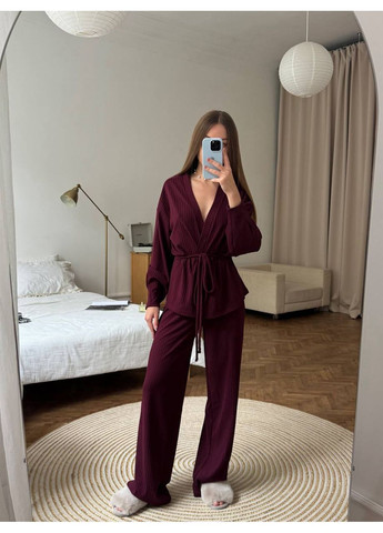 Костюм виготовлений з м'якої трикотажної ангори, яка має фактуру машинної в'язки. Тканина має середню розтяжність, враховуйте це під час підбору розміру. Завдяки своєму фасону на запах — костюм гарно сідає по фігурі. Жакет з довгими рукавами фасону ліхтарик на манжетах, плечовий шов спущений, що створює вільний силует. Також він має V-подібний виріз декольте в закритому положенні. Додатково жакет оснащений поясом в колір костюма. Штани з високою посадкою та гумкою на талії без застібок, по боках присутні кишені з відрізним бочком.