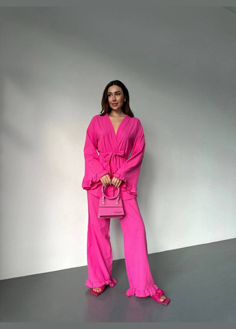 Мінімалістичні текстурні костюми в п'яти кольорах максимально універсальні та практичні. Такий костюм забезпечить Вам максимальний комфорт та затишок. Завдяки ідеальному лекалу виріб буде максимально ідеально підходити будь-якій фігурі. В комплекті вкорочений халат вільного крою на запах. Виріб доповнено накладними кишенями по боках, а пояс фіксується на шльовках на талії. Штани прямого крою на манжеті з гумкою на талії та бічними кишенями. Орієнтовні заміри готового виробу: Халат: 46-48 р-р: довжина виробу: 98 см, обхват рукава 44 см, довжина рукава 11/54 см, ОГ-112 см, ОТ-112 см, OC-116 см.50-52 р-р: довжина виробу: 98 см, обхват рукава 46 см, довжина рукава 12/55 см, ОГ-120 см, ОТ-120 см, OC-124 см. 54-56 р-р: довжина виробу: 98 см, обхват рукава 48 см, довжина рукава 13/56 см, ОГ-128 см, ОТ-128 см, OC-132 см. 58-60 р-р: довжина виробу: 98 см, обхват рукава 50 см, довжина рукава 14/57 см, ОГ-136 см, ОТ-136 см, OC-140 см. 62-64 р-р: довжина виробу: 98 см, обхват рукава 52 см, довжина рукава 15/58 см, ОГ-144 см, ОТ-144 см, OC-148 см. 66-68 р-р: довжина виробу: 98 см, обхват рукава 54 см, довжина рукава 16/59 см, ОГ-152 см, ОТ-152 см, OC-156 см. Брюки: 46-48 р-р: довжина брюк по внутрішньому шву 76 см, довжина брюк по зовнішньому шву з урахуванням пояса 108 см, ОТ-70/93 см, OC-114 см. 50-52 р-р: довжина брюк по внутрішньому шву 77 см, довжина брюк по зовнішньому шву з урахуванням пояса 109 см, ОТ-78/101 см, OC-122 см. 54-56 р-р: довжина брюк по внутрішньому шву 78 см, довжина брюк по зовнішньому шву з урахуванням пояса 110 см, ОТ-86/106 см, OC-130 см. 58-60 р-р: довжина брюк по внутрішньому шву 79 см, довжина брюк по зовнішньому шву з урахуванням пояса 111 см, ОТ-94/114 см, OC-138 см. 62-64 р-р: довжина брюк по внутрішньому шву 80 см, довжина брюк по зовнішньому шву з урахуванням пояса 112 см, ОТ-102/122 см, OC-146 см. 66-68 р-р: довжина брюк по внутрішньому шву 76 см, довжина брюк по зовнішньому шву з урахуванням пояса 113 см, ОТ-110/130 см, OC-154 см.
