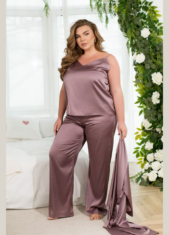 Костюм-трійка з шовку Армані – елегантність, легкість та ідеальний комфорт. Халат на запах без застібок, що красиво драпірується і створює витончений силует. У комплекті пояс, який фіксується за допомогою двох шльовок з боків. Манжети на рукавах надають завершеного вигляду. Майка на тонких бретелях із регулюванням, що забезпечує ідеальну посадку. Дві діагональні виточки спереду підкреслюють лінії фігури, надаючи образу витонченості. Штани вільного крою із гумкою на талії забезпечують максимальний комфорт. Бічні кишені надають практичності. Шовк Армані - це преміальна тканина з м'якою текстурою, що струмує, яка дарує відчуття ніжності на шкірі. Вона невагома, приємна до тіла, добре пропускає повітря та має легкий шляхетний блиск. Цей костюм – ідеальний вибір для тих, хто цінує вишуканий стиль, затишок та розкішні матеріали.