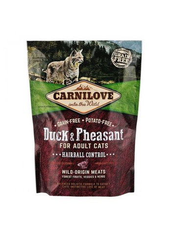 Carnilove Cat Duck&Pheasant Hairball Control — повнораціонний беззерновий сухий корм класу холістик із м'ясом качки та фазана. Формула без зернових і картоплі для дорослих кішок збагачена буряковою клітковиною, яка сприяє виведенню вовняних грудочок. Склад: борошно з м'яса качки (34%), борошно з м'яса фазана (25%), жовтий горох (12%), курячий жир (консервований токоферол, 6%), буряковий жом (5%), качка без кісток (5%), куряча печінка (3%), лососева олія (2%), тапіоковий крохмаль (2%), яблука (2%), морква (1%), насіння льону (1%), нут (1%), гідролізовані панцири ракоподібних (джерело глюкозаміну, 0.026%), хрящовий екстракт (джерело хондроїтину, 0.016%), пивні дріжджі (джерело маннаноолігосахаридів, 0.016%), корінь цикорію (джерело фруктоолігосахариди, 0.012%), екстракт юки Шидигера (0.01%), водорості (0.01%), подорожник (0.01%), чебрець (0.01%), розмарин (0.01%), орегано (0.01%), журавлина (0.0008%), чорниця (0.0008%), малина (0.000%). Енергетична цінність: 3800 ккал/кг. Омега-3: 0.33%, Омега-6: 2.28%. Рекомендації щодо годування: давати корм сухим або змоченим у теплій воді або бульйоні. Годувати кота необхідно тричі на день. Кількість корму може бути змінена залежно від віку та активності вашого кота. Коли годуєте кормом Carnilove вперше, змішуйте невелику кількість із попереднім кормом і збільшуйте співвідношення поступово упродовж тижня. Завжди перевіряйте наявність свіжої води.