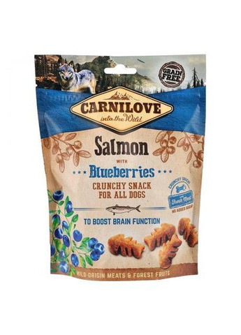 Carnilove Crunchy Salmon with Blueberries – вишукані ласощі зі свіжим лососем і чорницею для собак. Снеки мають беззернову рецептуру, а чорниця є природним джерелом антиоксидантів для правильної функції мозку. Рекомендації з годування: дотримуватися рекомендаційних норм, вказаних на упаковці товару. Намагайтеся не перегодовувати улюбленця. Слідкуйте за тим, щоб у вихованця був завжди доступ до питної води. Склад: лосось 50% (лосось сушений 35%, лосось свіжий 15%), гарбуз 15%, жовтий горох 8%, сушені яблука 5%, морква 5%, нут 4%, чорниця 4%, курячий жир (консервований токоферолами) 4%, льон 2%, сушений шпинат 2%, лляна олія 1%. Аналітичні компоненти: сирий протеїн 33,0%, cирий жир 11,0%, волога 10,0%, сира зола 7,5%, сира клітковина 5,8%, кальцій 1,1%, фосфор 0,9%, омега-3 0,5%, омега-6 1,0%. Містить природні антиоксиданти. Енергетична цінність: 3 380 ккал/кг