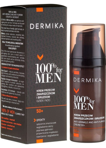 Шкіра будь-якої людини з плином часу починає старіти. Якщо для жінок звично застосовувати антивікові косметичні засоби, то більшість чоловіків скептично до них ставиться. Крем проти глибоких зморшок від бренда Dermika бореться зі стереотипами і намагається довести, що цей засіб необхідний чоловікам, які хочуть виглядати молодо і привабливо. Якщо ви бажаєте візуально прибрати кілька років від свого віку, тоді Dermika Anti-Wrinkle And Anti-Furrow Cream 50+ стане хорошим помічником у цій стратегічній справі. Активний комплекс інгредієнтів бореться зі зморшками і покращує гідратацію. Пептиди, що входять до складу, стимулюють синтез колагену, сприяючи пружності та еластичності шкірного покриву. За допомогою церамідів — природних ліпідів — ви зможете зняти подразнення і свербіння, викликані використанням гігієнічних засобів. Вони допоможуть поповнити власні цераміди, втрачені у процесі старіння шкіри. Крем проти глибоких зморшок зробить шкірний покрив м'яким і відновить його захисні функції. Спосіб застосування: нанести крем на чисту шкіру обличчя.