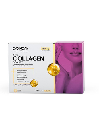Вміст елементів у 1й порції: 1 тюбик Пептиди колагену 5500 мг Гіалуронова кислота 100 мг Екстракт зеленого чаю 50 мг Глутатіон 7 мг Коензим Q10 5 мг Вітамін C 300 мг Вітамін E 30.44 мг Вітамін B5 3 мг Вітамін B6 0.84 мг Вітамін В7 500 мкг Інгредієнти Деіонізована вода, колагенові пептиди, регулятор кислотності (лимонна кислота, L-аскорбінова кислота (вітамін C)), ароматизатор манго, гіалуронова кислота, DL-альфа-токоферол (вітамін E), екстракт зеленого чаю, консерванти (сорбат калію, бензоат натрію), підсолоджувачі (сукралоза), концентрат соку чорної моркви, L-глутатіон, коензим Q10, кальцій D-пантотенат (вітамін B5), піридоксину гідрохлорид (вітамін B6), D-біотин.