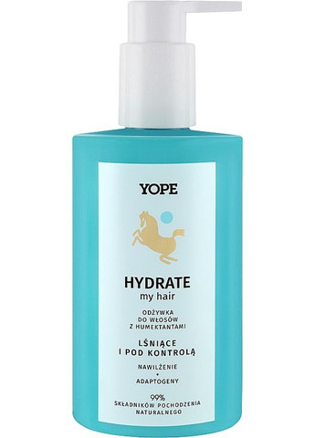 Сухі й ламкі пасма перестануть бути вашою головною проблемою з цим кондиціонером для волосся зі зволожувачами від бренда Yope. Завдяки унікальній формулі, що поєднує велику кількість натуральних компонентів, локони отримають інтенсивне живлення, стануть м'якішими й слухнянішими. Крім того, у складі засобу містяться екстракти червоних і бурих водоростей, які роблять пасма блискучими й здоровими. Освіжальний аромат допоможе розслабитися і зарядитися енергією на весь день. Особливості Yope Hydrate: – екстракт водоростей підтримує еластичність, усуваючи проблему ламкості;– масло бакурі дарує локонам інтенсивне зволоження;– екстракт оливи надає пом’якшення, зміцнює пасма;– екстракт базиліка покращує пружність волосся;– зберігає приємний аромат після миття;– значно полегшує процес розчісування;– зменшує статичну електризацію;– робить волосся слухнянішим;– на 99% натуральна формула.