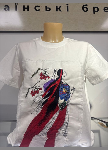Оригінальна біла футболка з унікальною аплікацією, що зображує витончену дівчину з довгим, вільно спадаючим волоссям, у якому переплітаються чорні та червоні пасма, та прикрашеним синіми та жовтими елементами. Навколо неї видніються гілки з червоними ягодами, що надає дизайну етнічного або фольклорного мотиву. Декоративний елемент виконаний комбінованою технікою, що поєднує вишивку та об'ємні тканинні деталі, які надають виробу особливого шарму та ексклюзивності. Ця футболка стане чудовим доповненням до вашого гардеробу, підкреслюючи індивідуальність та художній смак. Таблиця замірів виробу (см): Примітка: Заміри зроблені у статичному вигляді без натягування. Розміри українські. Розмір Довжина Напівобхват грудей 40 67 48 42 67 49 44 67 50 46 67 52 48 67 55 50 70 56 52 73 58 Рекомендації по догляду: Ручне прання або делікатний режим прання в пральній машині при температурі не вище 30°C. Прати навиворіт. Не відбілювати. Сушити в розправленому вигляді на горизонтальній поверхні або на вішалці, уникаючи прямих сонячних променів. Прасувати з вивороту при низькій температурі, уникаючи прасування аплікації та об'ємних деталей.