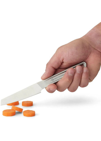 Sea to Summit Detour Stainless Steel Kitchen Knife - кухонний ніж виготовлений з високоміцної литої нержавіючої сталі, що забезпечує довготривалу гостру кромку та стійкість до іржі та плям. Він має ідеально збалансовану вагу і чудово підходить для різання з точністю і комфортом. Чудовий вибір для ваших пікніків та кемпінгу на природі. Призначення: кемпінг, пікніки туристичні походи. Особливості: - виготовлений з високоміцної литої нержавіючої сталі для довготривалої гострої кромки - стійкий до іржі, корозії та плям - ідеально збалансована лита конструкція з необхідним ступенем гнучкості для точного різання - універсальний кухонний ніж, який робить приготування їжі швидшим, безпечнішим і приємнішим - включає чохол для безпечного зберігання та захисту гострої кромки леза Характеристики: Розмір: 25.8 x 4 x 1 см Довжина без чохла: 25.5 см Вага: 148 г