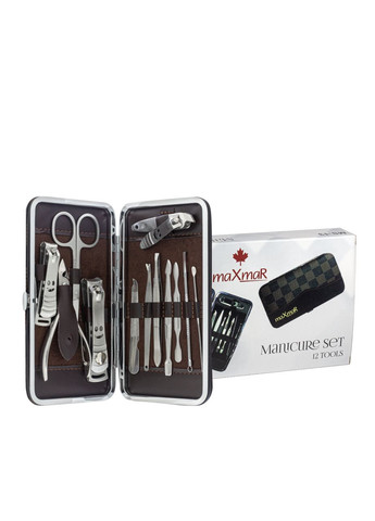 Манікюрний набір maXmaR з 12 інструментів в шкіряному футлярі МЅ-13 Всі маникюрні інструменти відрізняються міцним матеріалом виготовлення (спеціальна нержавіюча сталь), високою якістю кування, довговічністю, зручністю у використанні, а також першокласним дизайном. За допомогою ретельно продуманих і доведених до досконалості знарядь можна без зайвих витрат і зусиль підтримувати ручки в доглянутому вигляді. Предмети в наборі заточені і готові до застосування. Набір упакований в стильний компактний чохол. Комплектація: ножиці маникюрні — 1 шт; кніпсери — 3 шт; пилочки, лопатки, резець — 7 шт. різних видів; кусачки манікюрні — 1 шт; чохол.