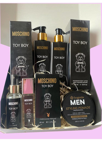 До складу набору входить: 1. Moschino Toy Boy Pheromone Parfum чоловічий 40 мл 2.Парфумований гель для душу для чоловіків Moschino Toy Boy 250 мл 3. Парфумований лосьйон для тіла Toy Boy, 250 мл 4. Парфуми чоловічі Toy Boy, 68 мл 5.Чоловіча помадка Man Hair Styling Clay Bogenia 6. Подарункова коробка + стружка