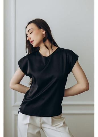 Жіноча блуза чорного кольору з вмістом шовку та віскози. Має короткий рукав і прямий крій. Горловина округлої форми, без оздоблення. Поверхня гладка, з легким шовковим блиском. Тканина м’яка на дотик, приємна до тіла. Шви рівні, крій лаконічний, силует вільний.
