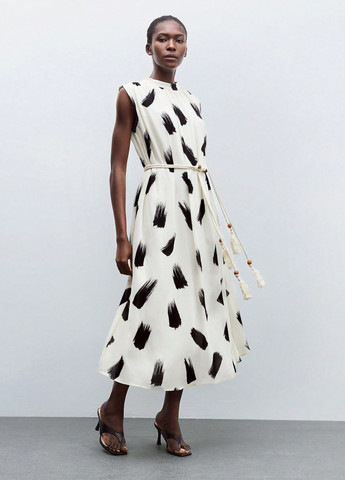 Жіноча сукня Maija з принтом "мазки пензля". Довга сукня вільного крою з чорним кольоровим принтом. Прямий поділ та середня лінія талії. Сукня вільного А-силуету, що підходить для вечірніх виходів. Сукня виконана з поліестерової тканини. Виріз горловини – стійка.