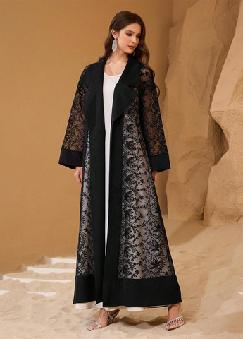Сукня абайя Al Najma - чорна. Ця елегантна абайя максі-довжини та вільного крою. Прозорий крій із кольоровим рослинним візерунком. Абайя має виріз з відворотом, контрастне мереживне оздоблення та пояс. Прати вручну.