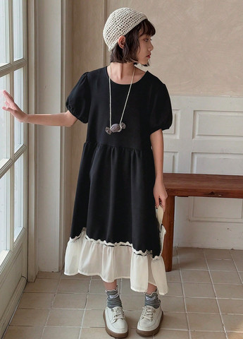 Сукня DAZY для дівчаток-підлітків у кольорових блоках, чорна. Сукня з круглим вирізом та рукавами-буфами, оборкою по низу та високою талією. Призбірне полотно забезпечує вільний крій. Деталі: контрастна сітка та вишивка. Тільки машинне прання.