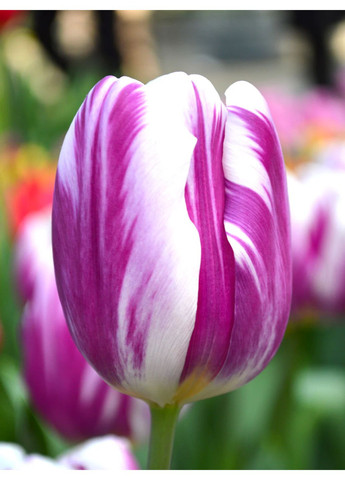 Тріумф тюльпан Flaming Flag - це той момент, коли навіть сама рослина до цвітіння виглядає неймовірно красиво та вражаюче! Мечоподібне сіро-зелене листя, що спрямоване прямо вгору так і вабить вже здалеку. А коли цей красень розцвітає наприкінці квітня - на початку травня, то справді виглядає неймовірно: акуратні чашоподібні квіти кольору слонової кістки, пофарбовані в пір'їсті відтінки від блідого до насиченого лавандового та бузкового кольорів. Стильні мазки, ніби пензлем художника, роблять цей тюльпан вигідним вибором серед інших однотонних тюльпанів на одній клумбі або біля бордюрів, але найкраще садити цей сорт групами одразу з декілька цибулин - так ви створите вражаюче квіткове шоу. Виростає заввишки він лише до 40-45 см, а тому навіть для посадки в горщиках цей сорт підходить ідеально. А ви лишень уявіть як він виглядатиме разом з мініатюрними мускарі чи яскравими нарцисами - ну просто мед для очей! Тріумф тюльпани - улюблениці всіх садівників та флористів. Кожен їх сорт буквально чарує і створює дуже елегантну та насичену атмосферу. А ще ці красені, як правило, низькорослі і виростають до 50 см заввишки - вони формують дуже міцні стебла, а тому є стійкими до вітру, дощів та інших погодних факторів. Ну просто ідеальний вибір - як для досвідчених аграріїв, так і для тих, хто лише починає займатися квітникарством. Зараз представлено понад 1000 сортів цих тюльпанів, тож абсолютно кожен може знайти те, що до вподоби саме йому. Ідеальні умови для вирощування: висаджувати цибулини тюльпанів найкраще восени, орієнтовно це вересень - початок жовтня. Глибина посадки — приблизно 15–20 см (від основи цибулини), а для довговічних сортів — до 30 см. Відстань між рослинами — 10–15 см. У кожну лунку варто додати жменю компосту або спеціального добрива для цибулин — це допоможе молодим корінцям швидше прижитися. Садіть верхівкою догори, а якщо не впевнені — боком: природа сама розбереться. Тюльпани люблять сонце та легкий, добре дренований ґрунт. Найгірше, що може з ними статися — це волога ділянка: там цибулини швидко загнивають. Тому обирайте місце, де не застоюється вода, і де рослини отримають щонайменше 6 годин сонця на день. Після цвітіння не поспішайте обрізати листя — саме воно накопичує поживні речовини для нових цибулин. Видаліть лише квітконоси, щоб рослина не витрачала сили на насіння. Листя має дозріти протягом 6 тижнів. Підживлюйте навесні або восени добривом із низьким вмістом азоту, компостом або перепрілим гноєм — тюльпани віддячать за це щедрим цвітінням.