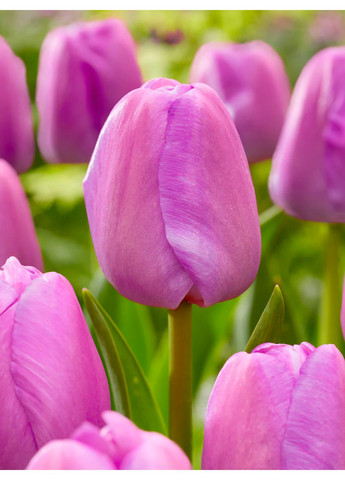 Тюльпан Дарвіна Purple Pride - представляємо вашій увазі один із найпопулярніших у професійному озелененні сортів тюльпанів, зокрема й завдяки своїй стійкості та декоративності. Це яскравий представник лілово-пурпурової гами з насиченим, глибоким тоном, що нагадує класичний королівський пурпур. Якщо пастельні відтінки – ваша весняна естетика, то додавання цукерково-фіолетових тюльпанів з холодним, але насиченим кольором, таких як тюльпан Purple Pride, до вашої схеми посадки допоможе досягти цієї блаженної, ніжно-відтіночної квіткової досконалості. Рослина виростає до 55–60 см, має потужне стебло і міцну структуру бутону. Пелюстки великі, м’яко хвилясті по краях, із сатиновим блиском. Починає цвісти цей красень вже в середині весни й довго зберігає свіжий вигляд, навіть під дощем. Він не лише гарний, а й довговічний — справжня знахідка серед тюльпанів. А ще він чудово поєднується з кремовими або контрастними жовтими сортами. Його кольорова глибина допомагає створювати сильні акценти в квітниках або на алеях. Purple Pride — це благородство у чистому вигляді, що завжди виглядає презентабельно. Тюльпани Дарвіна - це одні із найпопулярніших видів серед родини тюльпанів і до того ж з’явилися на ринку вони не так давно, та вже встигли завоювати собі неабияку популярність серед садівників з усього світу. Це пояснюється рядом переваг на фоні інших тюльпанів: передовсім, це дуже високорослі рослини, що можуть сягати від 50 до 70 см; бутони теж виростають дуже великі - їх діаметр може бути 12 см, а висота самого келиха 10-13 см!; порівняно з іншими видами, ці тюльпани ще й мають досить малий вегетаційний період і розквітають одні з перших. І ледь не забули вказати головну особливість - велика стійкість до хвороб та шкідників. Ідеальні умови для вирощування: висаджувати цибулини тюльпанів найкраще восени, орієнтовно це вересень - початок жовтня. Глибина посадки — приблизно 15–20 см (від основи цибулини), а для довговічних сортів — до 30 см. Відстань між рослинами — 10–15 см. У кожну лунку варто додати жменю компосту або спеціального добрива для цибулин — це допоможе молодим корінцям швидше прижитися. Садіть верхівкою догори, а якщо не впевнені — боком: природа сама розбереться. Тюльпани люблять сонце та легкий, добре дренований ґрунт. Найгірше, що може з ними статися — це волога ділянка: там цибулини швидко загнивають. Тому обирайте місце, де не застоюється вода, і де рослини отримають щонайменше 6 годин сонця на день. Після цвітіння не поспішайте обрізати листя — саме воно накопичує поживні речовини для нових цибулин. Видаліть лише квітконоси, щоб рослина не витрачала сили на насіння. Листя має дозріти протягом 6 тижнів. Підживлюйте навесні або восени добривом із низьким вмістом азоту, компостом або перепрілим гноєм — тюльпани віддячать за це щедрим цвітінням.