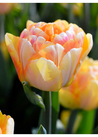 Махровий тюльпан Foxy Foxtrot - ранній сорт, що збирає свої гофровані пелюстки в квітку, яка нагадує півонію або троянду, а коли повністю розпускається, то створює справжній “вау-ефект” на будь-якій ділянці. Пишний, багатошаровий бутон гармонійно поєднує золотисто-жовтий, мандариновий, абрикосовий та відтінки лососево-рожевого в кожній квітці - нагадує неймовірний світанок після дощової ночі! Заввишки рослина досягає 35–45 см, що робить її чудовим варіантом для переднього плану клумби або яскравого акценту в квітнику. Квітка щільна, майже куляста, а діаметр іноді сягає 10–12 см. Під час цвітіння, (а воно, як правило, припадає на квітень-травень), тримається до двох тижнів і не втрачає декоративності, навіть коли повністю розкривається. Завдяки тривалому періоду цвітіння, цей тюльпан подарує вам багато тижнів яскравих кольорів. Його можна чудово поєднувати з іншими ранньовесняними тюльпанами жовтого, помаранчевого або теплого рожевого відтінків. Махрові тюльпани - це одні із найбільш популярних та жаданих представників своєї родини. Вони нагадують мініатюрні півонії і зберігають декоративність протягом тривалого періоду часу. А ще головною особливістю махрових сортів є наявність густонабитих пелюсточок, які формують округлий чашоподібний бутончик. Різноманіття кольорів та відтінків вражає, а ще серед цього виду є безліч різнобарвних представників: з облямівками, вкрапленнями, рисками і т.д. Ми переконані, що серед величезного вибору, абсолютно кожен знайде те, що припаде йому до душі! Ідеальні умови для вирощування: висаджувати цибулини тюльпанів найкраще восени, орієнтовно це вересень - початок жовтня. Глибина посадки — приблизно 15–20 см (від основи цибулини), а для довговічних сортів — до 30 см. Відстань між рослинами — 10–15 см. У кожну лунку варто додати жменю компосту або спеціального добрива для цибулин — це допоможе молодим корінцям швидше прижитися. Садіть верхівкою догори, а якщо не впевнені — боком: природа сама розбереться. Тюльпани люблять сонце та легкий, добре дренований ґрунт. Найгірше, що може з ними статися — це волога ділянка: там цибулини швидко загнивають. Тому обирайте місце, де не застоюється вода, і де рослини отримають щонайменше 6 годин сонця на день. Після цвітіння не поспішайте обрізати листя — саме воно накопичує поживні речовини для нових цибулин. Видаліть лише квітконоси, щоб рослина не витрачала сили на насіння. Листя має дозріти протягом 6 тижнів. Підживлюйте навесні або восени добривом із низьким вмістом азоту, компостом або перепрілим гноєм — тюльпани віддячать за це щедрим цвітінням.