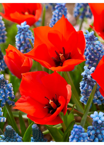 Ботанічний тюльпан Red Hunter (Червоний мисливець) - вражаючий сорт, що одразу ж приверне увагу, коли ви зайдете у свій сад! Він не просто дуже красивий, а ще й надзвичайно ароматний, має класичну келихоподібну форму, яка з часом розпускається у зіркоподібну і просто змушує закохатись у себе! Яскраві червоні квіти з чорною плямкою в центрі і справжнім оксамитовим сяйвом. А стебло рослин прикрашене привабливим, вертикальним, вузьким, сіро-зеленим листям. Це низькорослий сорт, що виростає заввишки лише 15-20 см, однак будьте певні це компенсується неймовірним зовнішніми виглядом аж з надлишком! Найкраще підходить для посадки групами із декілька цибулин - тоді результат цвітіння буде вражати - ціла палітра яскравих кольорів на одній клумбі! Ботанічні тюльпани - це окрема категорія свого роду, що поєднує всі різновиди дикорослих і гібридних сортів, які взяли від них свій початок. Це справжні «жайворонки»: вони цвітуть раніше за будь-які інші тюльпани та привертають увагу не лише завдяки своєму надзвичайно ранньому цвітінню, але й завдяки суцвіттю та яскравій гамі кольорів. Крім того, витончене розкриття квітів та гарне листя роблять їх привабливими до, під час та після цвітіння. Іншими словами, ботанічні тюльпани просто сповнені приємних характеристик. Ідеальні умови для вирощування: висаджувати цибулини тюльпанів найкраще восени, орієнтовно це вересень - початок жовтня. Глибина посадки — приблизно 15–20 см (від основи цибулини), а для довговічних сортів — до 30 см. Відстань між рослинами — 10–15 см. У кожну лунку варто додати жменю компосту або спеціального добрива для цибулин — це допоможе молодим корінцям швидше прижитися. Садіть верхівкою догори, а якщо не впевнені — боком: природа сама розбереться. Тюльпани люблять сонце та легкий, добре дренований ґрунт. Найгірше, що може з ними статися — це волога ділянка: там цибулини швидко загнивають. Тому обирайте місце, де не застоюється вода, і де рослини отримають щонайменше 6 годин сонця на день. Після цвітіння не поспішайте обрізати листя — саме воно накопичує поживні речовини для нових цибулин. Видаліть лише квітконоси, щоб рослина не витрачала сили на насіння. Листя має дозріти протягом 6 тижнів. Підживлюйте навесні або восени добривом із низьким вмістом азоту, компостом або перепрілим гноєм — тюльпани віддячать за це щедрим цвітінням.